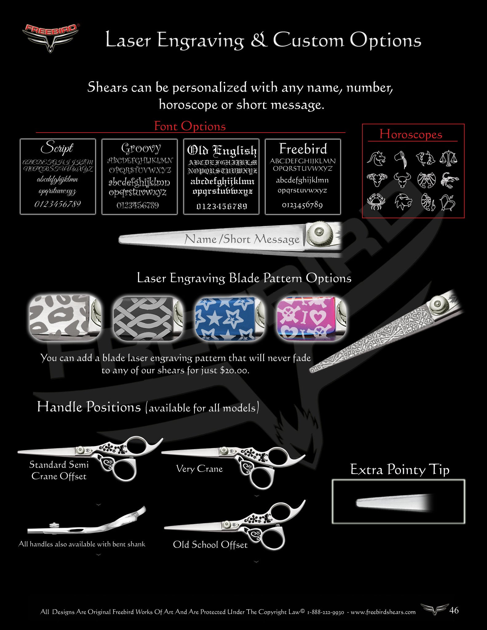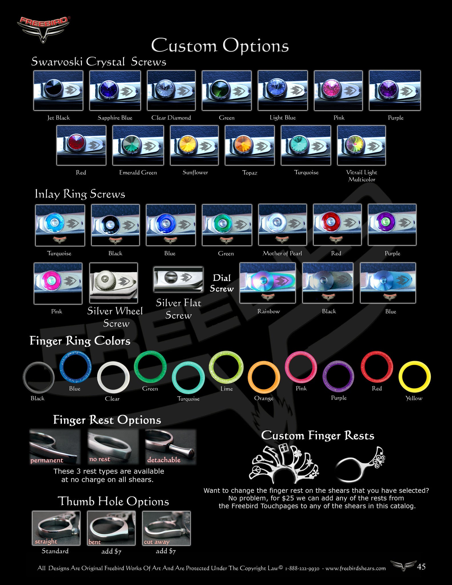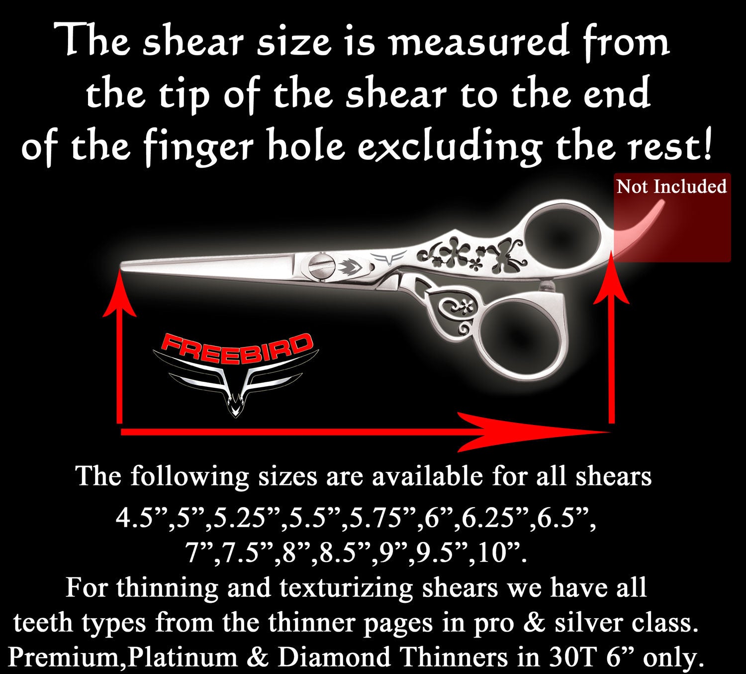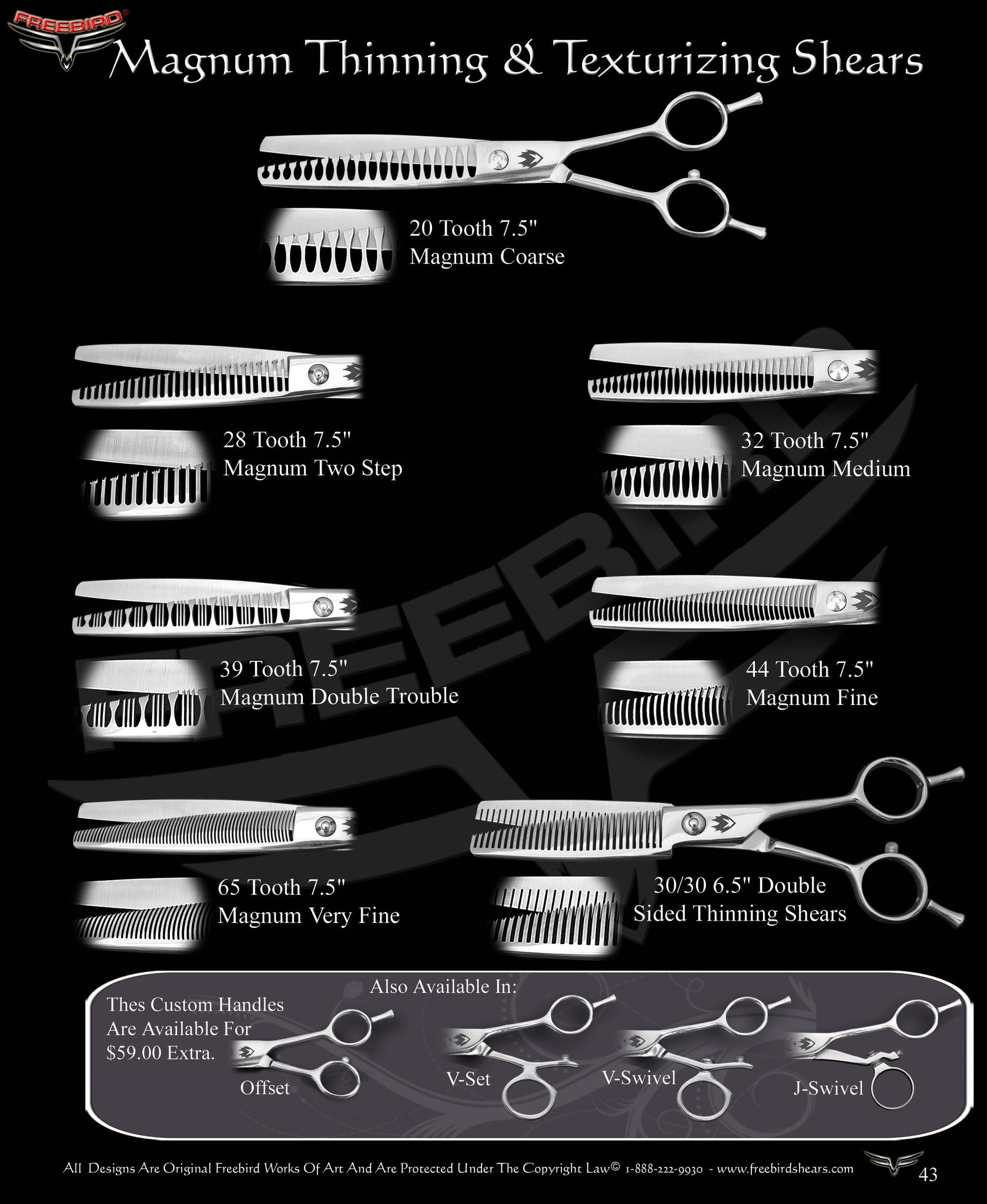 Freebird Shears is proud to present you the largest selection of reasonable priced thinning, texturizing and chunking shears on the face of the earth. Our in house thinning shear design department has designed more original teeth styles than any other manufacturer in the world!. One of our main focus is to provide quality thinning and texturizing tools at affordable prices. All of our Magnum thinners, texturizers and chunkers come with your choice of screw and accents as well as free optional name engraving. You can even add a custom Touch of Art in form of a custom finger rest to any of our thinning shears. The bottom line is, if you are looking for any type of shear with teeth you came to the right place!
